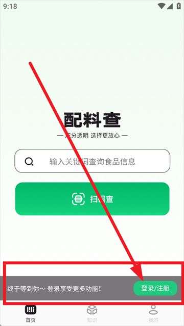 1、在本站下载安装并打开配料查app,点击下方登录/注册。