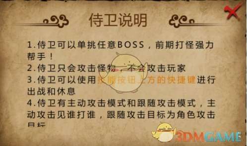 1、侍卫在游戏当中的定位有点像以前传奇里面的神兽,难抗能打,定位就是推BOSS的强力助手。