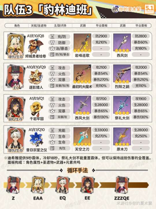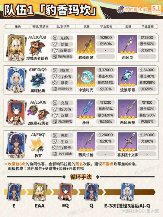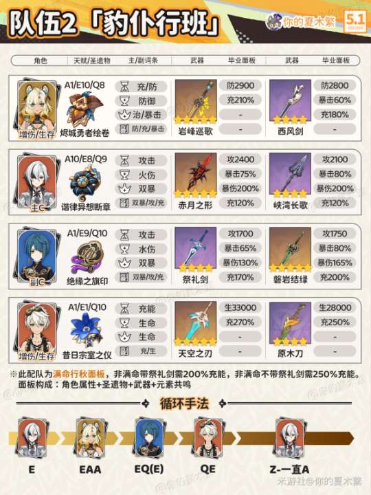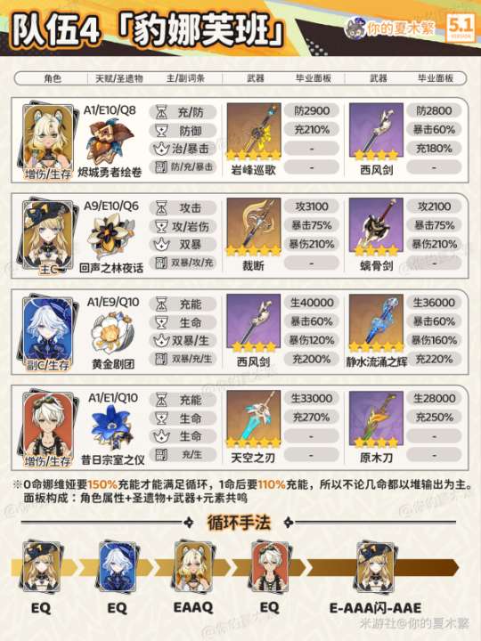 包含4个配队所有角色的武器、圣遗物、毕业面板和队伍循环手法