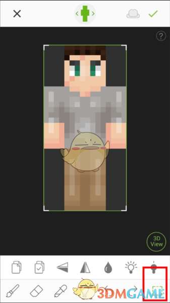 2、进入皮肤编辑界面,上方栏框中则代表取消编辑,以及选择编辑的部位。编辑底层皮肤或是第2层皮肤。以及确认保存的功能。