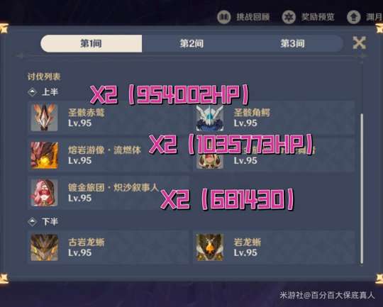 圣骸兽血量954002X2,熔岩游像1035773X2,镀金旅团681430X2,总计血量达到了惊人的532万!