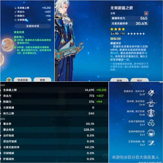 圣遗物是常规的逐影猎人套,双爆实战触发套装效果后为86%/228%,充能140%(满足单水角色循环)。