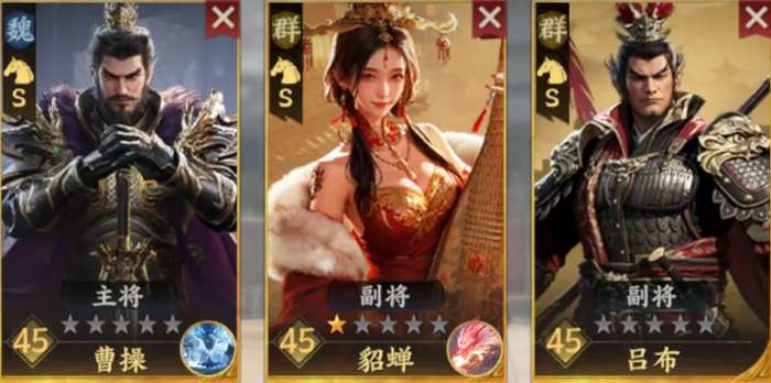 群伤骑阵容由吕布、曹操和貂蝉组成,是游戏中范围伤害最为恐怖的骑兵组合。这套阵容的核心思路是通过多重增伤效果叠加,将吕布的技能伤害提升至极限,从而实现对敌方全体的毁灭性打击。战斗数据显示,完全体的群伤骑在对抗密集阵型时,吕布单次技能可造成相当于常规状态500%的伤害,经常能实现"一技能清屏"的效果 。吕布作为阵容的绝对核心,拥有全游戏最高的武力成长(1.62),其主动技能"辕门射戟"能对大范围内的敌人造成基于武力值的横扫伤害,并100%概率对主目标施加"夺志"状态(降低30%攻击力)。吕布的被动"鸷搏狼抗"会根据技能命中的敌人数量提升自身输出,每命中一个目标增加8%伤害,持续10秒。在对抗5人队伍时,这一加成可达40%,与曹操和貂蝉的增伤形成恐怖叠加。