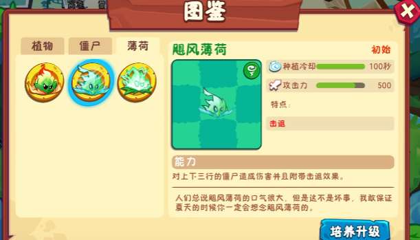 飓风薄荷在初始就有经常被人说口气很大,但它在战斗中却有着不错的击退作用,它的攻击力是500,种植冷却为100秒,能力是对上下三行的僵尸都造成伤害,并且还会附带上击退效果,减缓敌人前进的脚步,为植物创造输出机会。