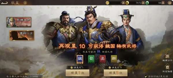 1、首推的就是活动-幸运观星,这个活动可以指定额外获取的稀有武将,这里推荐关羽,每250次观星为一轮,每一轮完成,可以获取大量的观星石和金珠和其他奖励,所以推荐开局先攒一攒观星石,等活动开启,疯狂梭哈,星级升的飞快