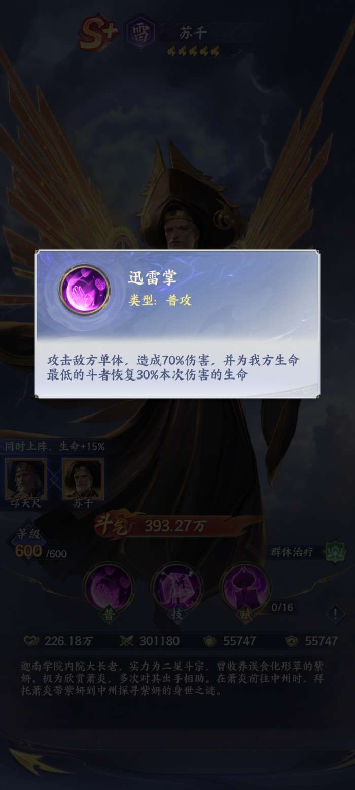 要说苏千的基础攻击手段就是迅雷掌,它其实具备守护的力量,一旦施展之后能够对敌人单体造成伤害,并且可以给自己队伍当中生命值最低的那位斗者恢复这次伤害的生命值,所以它的基础攻击技能,能够让苏千在输出的同时,也可以时时刻刻去关注自己队友的血线,能够保证整个团队续航。所以他的出现能够让整个队伍的生存能力得到很大的提升。