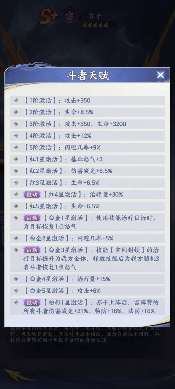 玩家需要注意,苏千的天赋系统也是比较强大的,而玩家需要让他自身的实力得到提升的时候,就需要进一步的提高他的天赋,比如他在最基础的阶段,此时它的生存跟输出能力将会更强,一旦突破了红阶,他就能够更快的去释放技能,并且还可以进一步地强化它的生存能力,当他到了白金进阶的时候,可以直接将空间封锁升级为全体治疗,额外还会带有群体的回怒值。