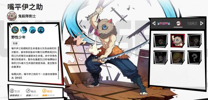 嘴平伊之助在《漫画群星大集结》中被明确划分为坦克类角色,与魔人布欧、春野樱等同属游戏中的防御型英雄阵营。作为团队的前排核心,伊之助的设计完美还原了原作中横冲直撞、野性难驯的形象特点,同时通过游戏机制赋予了他极强的生存能力和战场搅局能力。不同于传统意义上笨重迟缓的坦克形象,伊之助的特色在于高机动性的防御机制,这使他在保持足够坦度的同时,还能灵活穿梭于战场,对敌方后排造成持续威胁。从基础属性来看,伊之助拥有全游戏顶尖的生存能力,其生命值成长系数位列所有角色前列。但与其他坦克角色不同的是,他的防御属性并非来自静态的护甲或魔抗,而是依赖独特的动态护盾积累机制。这种设计使得熟练的伊之助玩家可以通过精准的走位操作,将理论上的生存能力转化为实战中的持续压制力。值得注意的是,伊之助的攻击属性在坦克角色中属于中等偏上水平,这让他不仅能够承担伤害,还能在适当时机打出可观的输出。