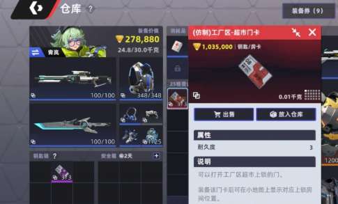 钥匙就属于一种消耗品,会有固定的耐久度,而且每使用一次就会降低一点耐久度。耐久度在耗尽之后,钥匙就会消失,高价值的钥匙,一定要选择妥善的保管。把钥匙装备好之后,小地图上就会直接有对应上锁房间的位置。进入地图之后,建议优先选择这些高价值的点位,可以迅速的拿到物资,还可以避开其他的玩家,将对方打一个措手不及。不同地图的钥匙房资源是各有各的侧重,例如工厂区的钥匙房,就可以刷新武器配件,山区的钥匙房就可以获得高级的材料,大家可以根据个人的需求去选择。