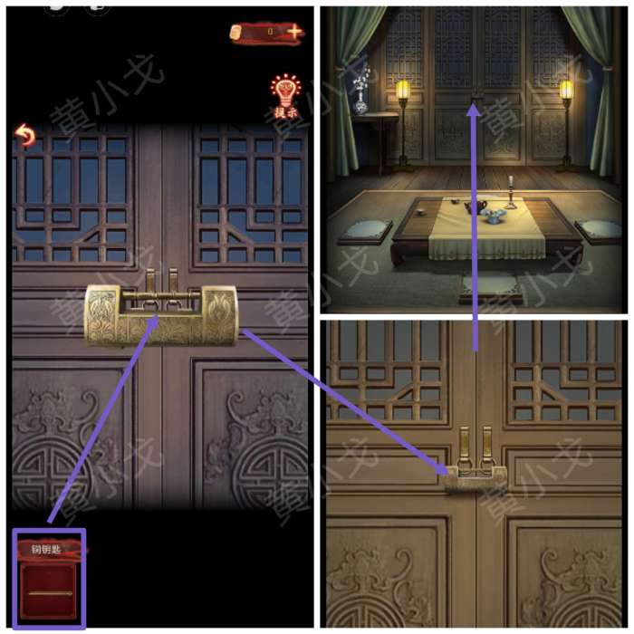 2.点击卧房门上的锁,用【铜钥匙】打开,进入卧房