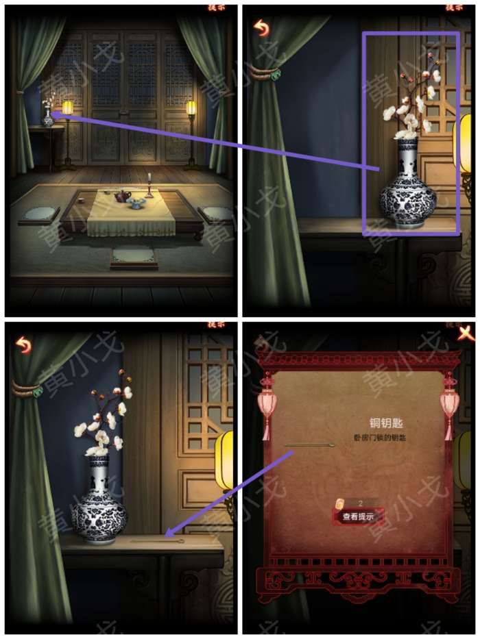 1.点击花瓶,挪开,获得【铜钥匙】