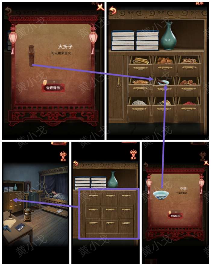 4.点击药柜,打开所有柜子,在最中间的柜子里获得【火折子】和【空碗】