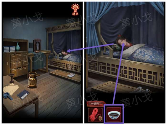 6.点击药罐,放入三种草药,用【火折子】点燃柴火,再用【空碗】装药,获得【一碗药】