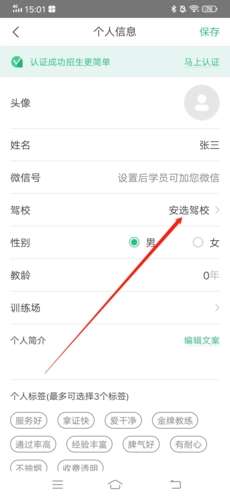 2、在个人信息页面中,就能看到当前所选择的“驾校”了,点击它;