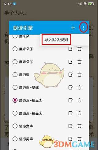 提示:如果你发现你的朗读引擎里没有这么多可选的,请点击此界面右上角的三个点,选择‘导入默认规则’后即可