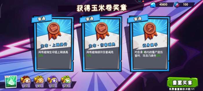 ps:当我们关卡里面击败星星僵尸后,可以选择玉米卷和玉米卷奖章的加成,优先选择加成阳光的,然后选择能够提升攻击力的,伤害减免的其次。