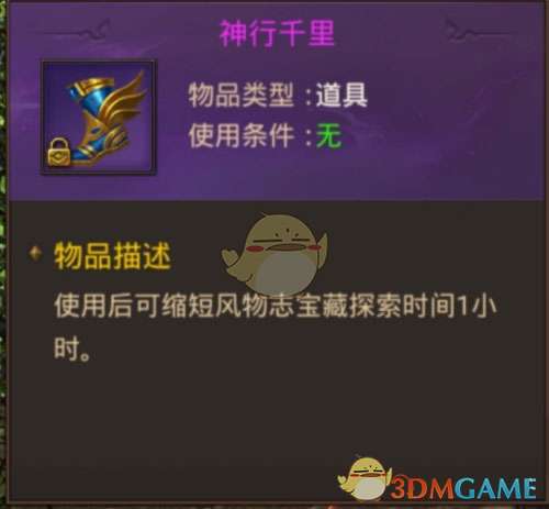c、探索是需要消耗时间的,如果大家等不及也可以消耗神行千里缩短探索时间,每个神行千里可以缩短1小时的探索时间,神行千里可以在商铺购买。