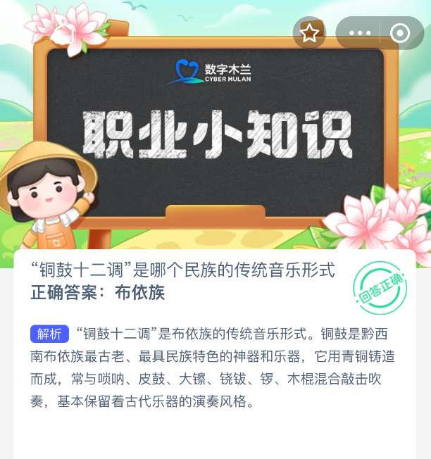 “铜鼓十二调”是哪个民族的传统音乐形式?【蚂蚁新村每日一题】2025年10月17日题目已发布!坚持答题,积累木兰币,即可加速小镇建设。答对本题,立即可享“产速+3/时”的加速奖励!今天正确答案是【布依族】。“铜鼓十二调”是布依族的传统音乐形式。它用青铜铸造而成,常与唢呐、皮鼓、大镲、铙钹、锣、木棍混合敲击吹奏,基本保留着古代乐器的演奏风格。