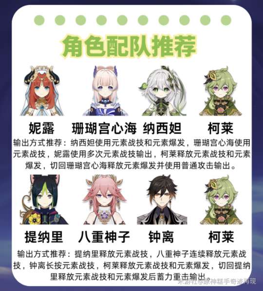 柯莱作为一位草元素后台角色,既可以作为副c培养,也可以只做挂草的工具人,下面带来两个主流玩法的配队展示: