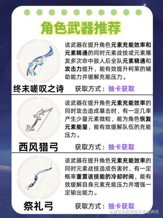 补充说明:除了图上推荐的三把武器之外,四星武器方面还可以选择落霞、绝弦等武器~