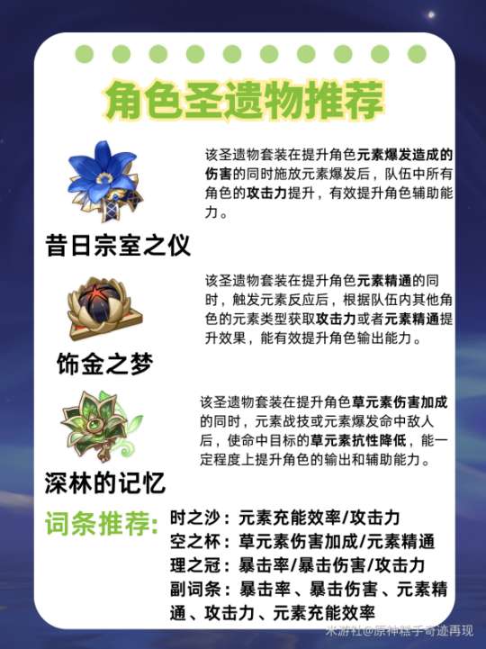 补充说明:饰金之梦套装适合主c玩法,深林的记忆套装和昔日宗室之仪套装更加偏向于辅助玩法。(建议优先使用深林的记忆,若队伍中有其他角色已经携带了此圣遗物套装,可以选择昔日宗室之仪替代)