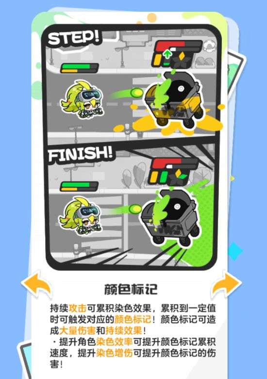 每位神明在攻击时都会给目标挂上对应的染色进度,当染色进度在短时间内累计到一定值后,便会触发对应的颜色标记,造成大量伤害和对应颜色的DOT效果。