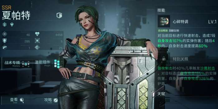 夏帕特在游戏中的定位,是重型坦克,核心技能心碎特调,可以对当前目标造成一次射击,同时造成自身基础攻击倍率,为107%的真实伤害,在后续的战斗当中,还能够提升自身射速的60%,属于一个攻防兼备的角色。