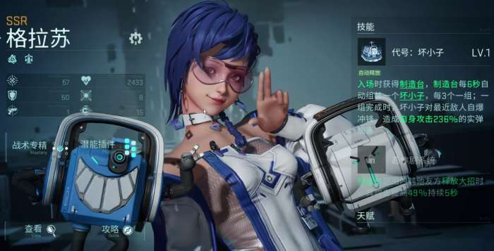 格拉苏在游戏内是工程型角色,持有的自爆型机器人可以持续召唤,大招则可以在释放之后,即可缩短全队的技能CD,属于游戏当中的泛用性高辅助,几乎适配所有的阵容,同时她还附带有一定的伤害补充性质。