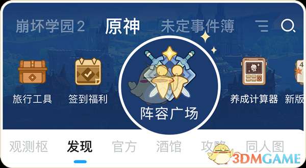 2、在米游社APP选择原神板块点击旅行工具,然后找到阵容广场即可前往详情页;
