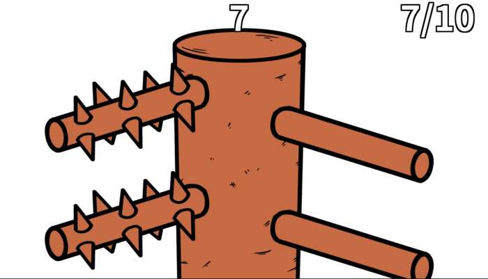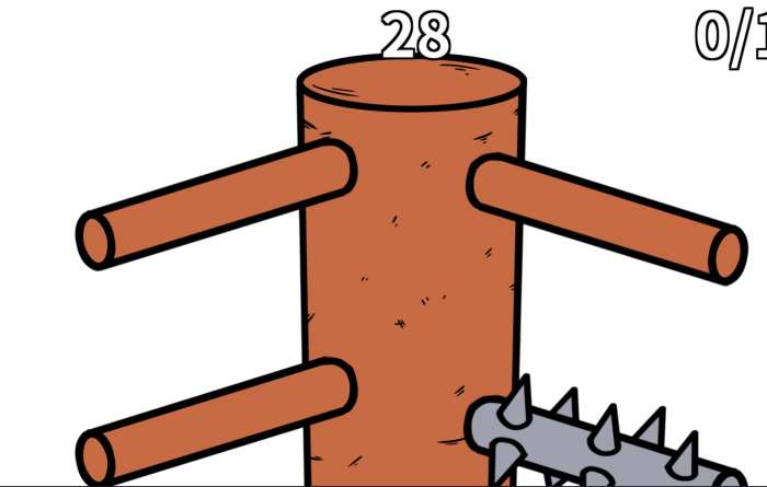 30秒内连续打掉10根木人桩上的柱子同时不被刺扎到。前5根木人桩上的刺为铁制,后五根为木制,本质上没区别但后者更容易被混淆。