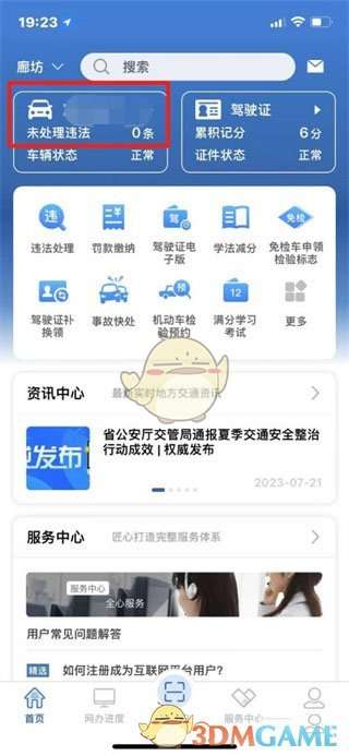 1、首先打开交管12123软件,进入到首页中可以查看资讯中心、服务中心等信息,我们在这里点击【车牌号】;