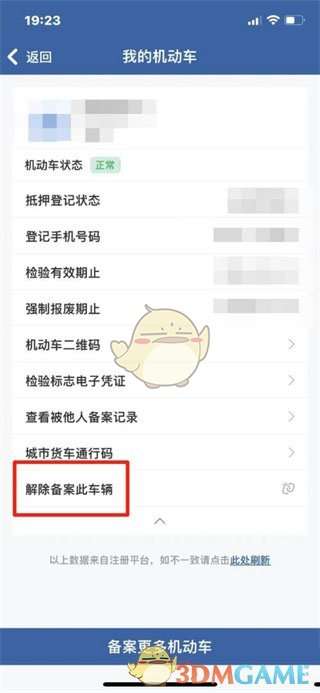 3、接着会有查看被他人备案记录、城市货车通行码、解除备案此车辆、机动车二维码等,我们点击【解除备案此车辆】;