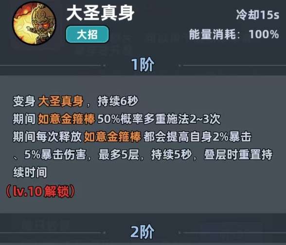 终极技能大圣真身就是核心的爆发,10级解锁之后就会冷却15秒。变身6秒内金箍棒就有50%的概率多重施法,在二阶之后还能提升施法的次数。每一次在触发金箍棒时,都会叠加2%的暴击率,还有5%的暴击伤害。最多可以叠加5层,叠层还会重置持续的时间,在变身期间,那可以说是越打越猛。养成方面属性优先级一定要抓准,所有的资源都应该往暴击相关属性方面倾斜。升星是比较关键的,解锁专属暴击加成之后就能迅速的提升压制力。