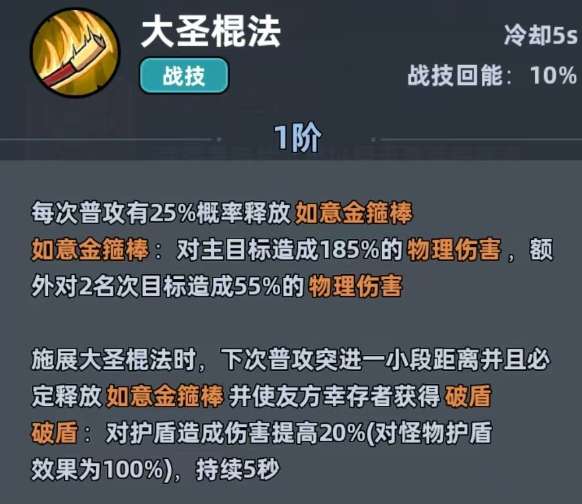 主动技能大圣棍法冷却只有5秒,普通攻击有25%的概率可以触发如意金箍棒。在针对主目标时就可以打出185%的物理性伤害,并且还会影响到两个相邻的单位,清理群怪的效率还是很不错。在释放这一个技能之后,下一次的普通攻击就会短距离的突进,并且还会触发金箍棒。更关键的是能够给全体的队友挂一个破盾buff,对于怪物护盾的伤害也会直接翻倍。在攻击护盾型的敌人时,那就根本就不需要头疼。等到技能提升到二阶时,普通攻击没有触发金箍棒的话,那么下一次触发概率就会提升25%。