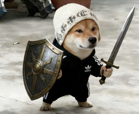 AI迷惑图:用AI生成狗头人身、手持刀盾的诡异画面,完美呼应“刀盾”二字,荒诞中带着一丝合理