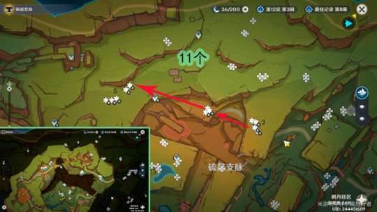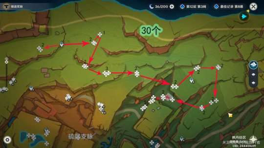 路线一:硫晶支脉上方,按箭头所示跑,亲测有效一趟下来并不费力。该区域可收集30个,数量还是非常可观的。