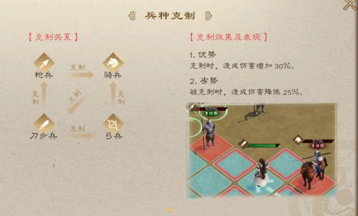 具有克制关系的兵种,克制对手时,我方造成的伤害增加30%;被对手克制时,我方造成的伤害降低25%。如:关羽为重骑兵、吕布为山地骑兵、孙策为轻骑兵;他们都属于骑兵,克制刀步兵,但被枪兵克制;当他们打刀步兵时,伤害会提升30%;但打枪兵时,伤害会降低25%。