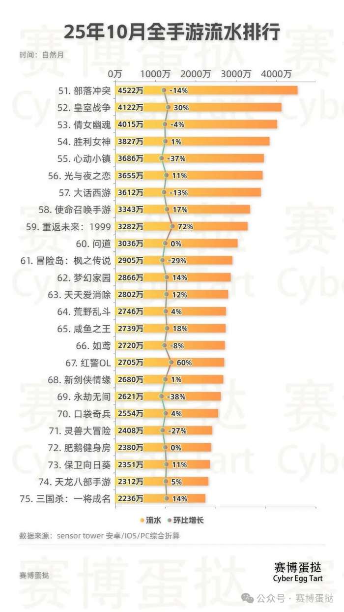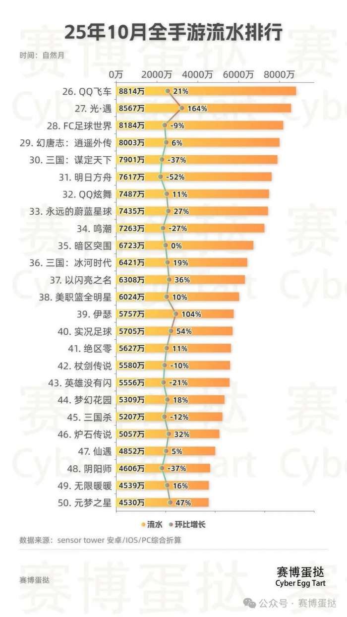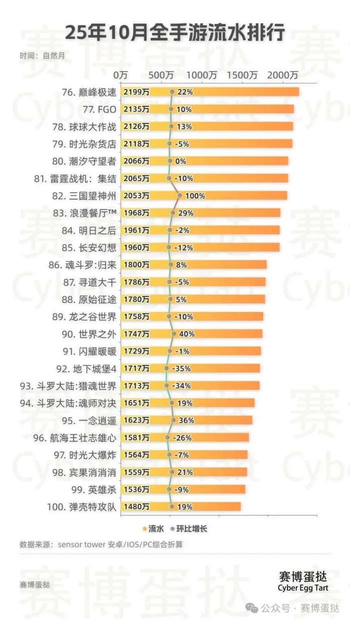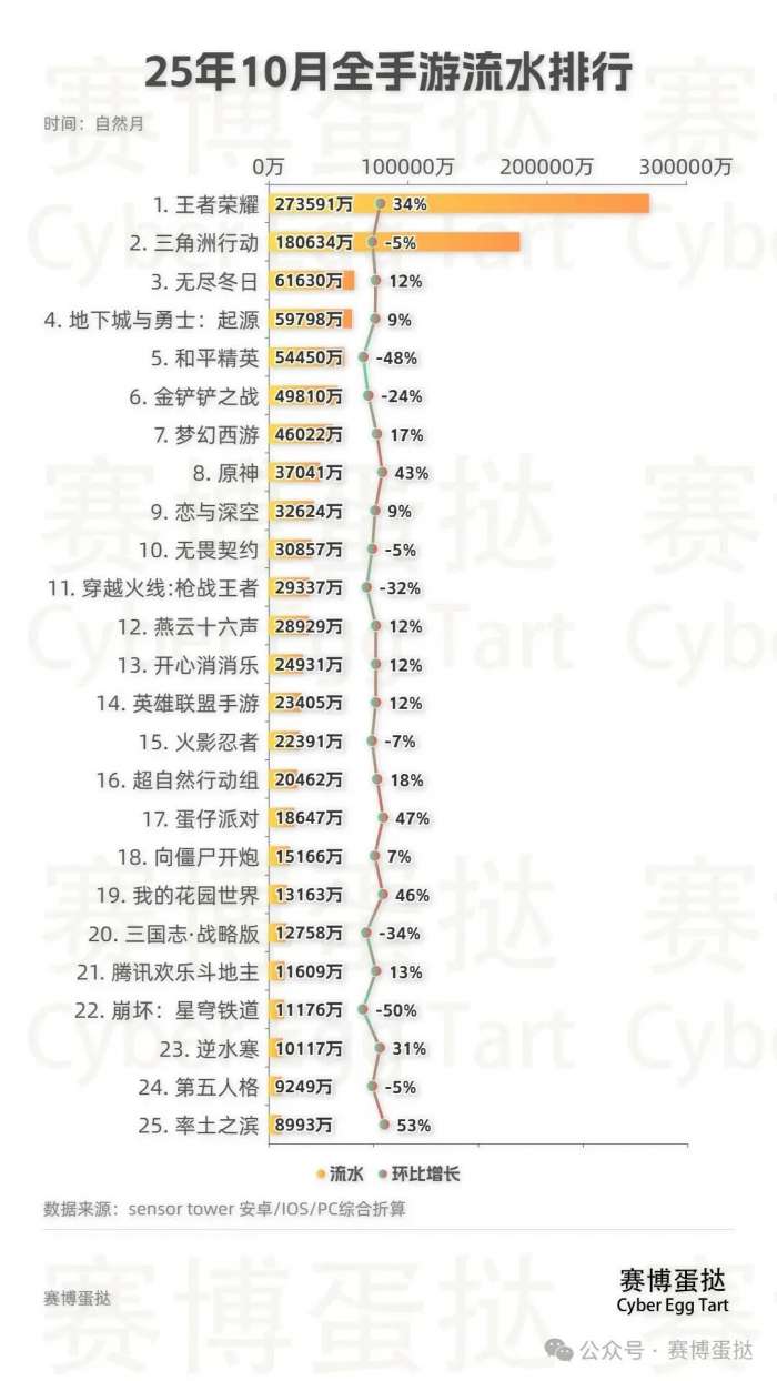 25年10月TOP100手游流水排行!王者荣耀周年庆断档领先!光遇、元梦之星、蛋仔派对、我的花园世界、原神、以闪亮之名等涨幅领先!