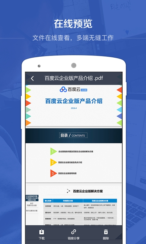 百度云企业版app是一款网络通讯应用,是款针对企业打造的移动云存储平台。百度云企业版app是百度在线网络设计开发的手机应用,可帮助用户管理文档、一键同步文件,以及享受安全的文件共享服务。