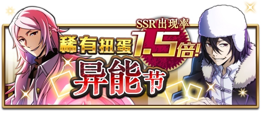 本次异能节依然是大家喜闻乐见的1.5倍SSR爆率,更有抽11次必得一张SSR的限定扭蛋,这两名各有魅力的反派角色有没有俘获你的心呢?来《文豪迷犬怪奇谭》得到他们吧!