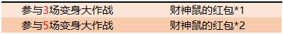 在指定的游戏模式中触碰局内出现的【财神鼠】,即可获得兑换道具【财神鼠的红包】,另外参与游戏内限时活动玩法(王者快跑、变身大作战)也可获得【财神鼠的红包】,收集一定数量的红包可兑换【鼠年纪念头像框】等好礼。