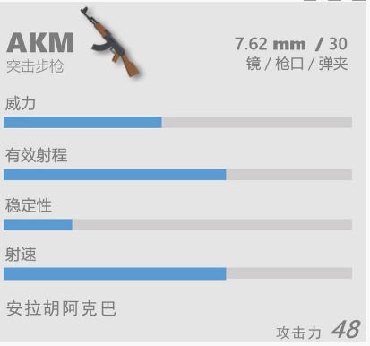 AKM的配件只能装枪口,弹夹和瞄准镜。而本身的稳定性并不好。这让它在战斗中只能用于中近距离,远距离只能单发点射。