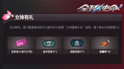活动期间,首次登陆游戏的玩家即可以邮件的形式获得“女神登录礼包”一份。礼包内含红粉佳人名片、金币五倍卡、经验五倍卡、能量棒。希望收到这份礼包的你们,能感受到女神带来的温暖,并在战斗中卓越成长。