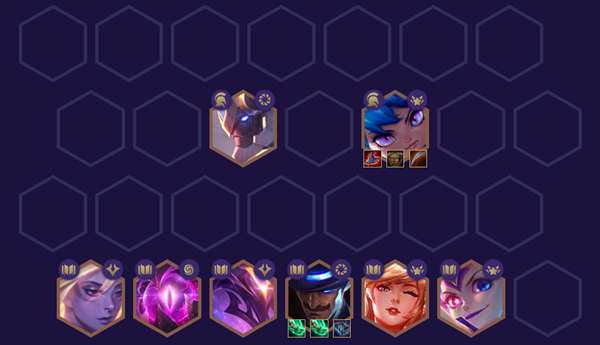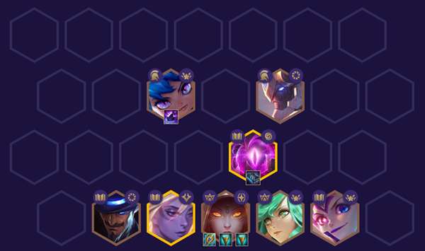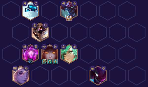 蒸汽机器人-布里茨、虚空恐惧-科加斯、魂锁典狱长-锤石、虚空之眼-维克兹、琴瑟仙女-娑娜、众星之子-索拉卡、光辉女郎-拉克丝、虚空掠夺者-卡兹克羁绊效果