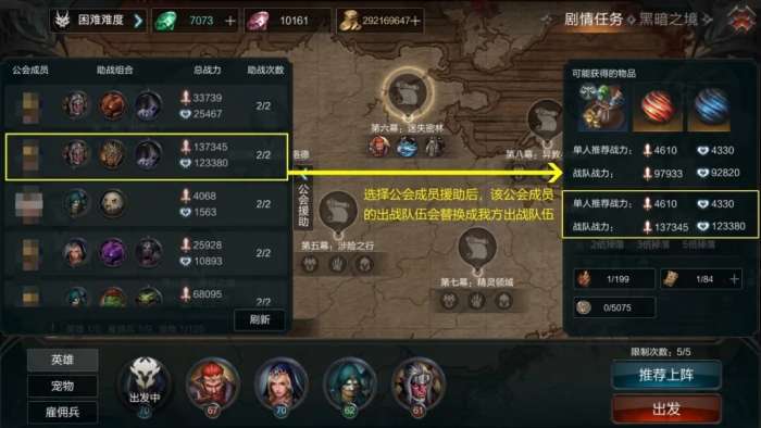 选择公会成员进行援助(将该公会成员的出战队伍替换成我方出战队伍),使用公会队伍助战后,当前战队战力为公会成员的队伍战力。每日最多可以邀请助战20次,每个公会成员可被邀请助战2次。