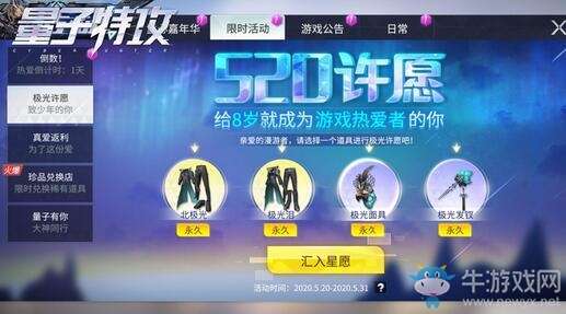 《量子特攻》520特别活动中,漫游者们只需要在北极光、极光泪、极光面具、极光发钗之中任选其一,就能许下自己的独特星愿!此后,漫游者们参与到阵营对决、六军闪击战等各类玩法中,就能完成任务收集星愿币:每天累计竞技场数、邀请好友助力等,同样会送上星愿币,只要达到指定数量,许下的星愿就能实现,把永久时装、外观带回家!