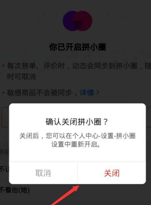 3、点击【关闭拼小圈】按钮在弹出对话框中点击【确定】;