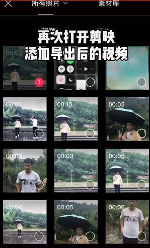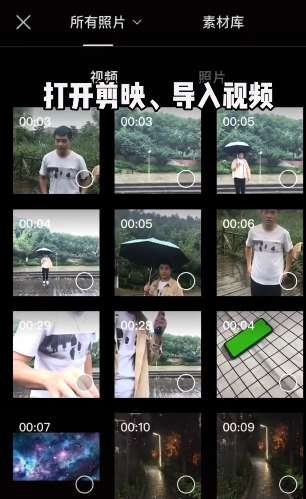 3.打开剪映APP,将拍摄的其中一段远景视频导入到剪映中;