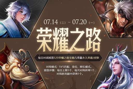S20荣耀之路宝箱:打开后可获得以下奖励之一:铭文碎片*5、钻石*5、永久英雄/皮肤/1日体验卡(夏侯惇、弈星、明世隐、老夫子、夏侯惇-战争骑士、弈星-踏雪寻梅、明世隐-占星师、老夫子-潮流仙人)