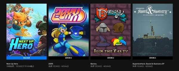 此外,Epic也公布了下周将送出的三款游戏:轻Rogue《20XX》、类Rogue第一人称地牢探索《Barony》和动作冒险游戏《超级兄弟:剑与巫术(Superbrothers: Sword & Sworcery EP)》。